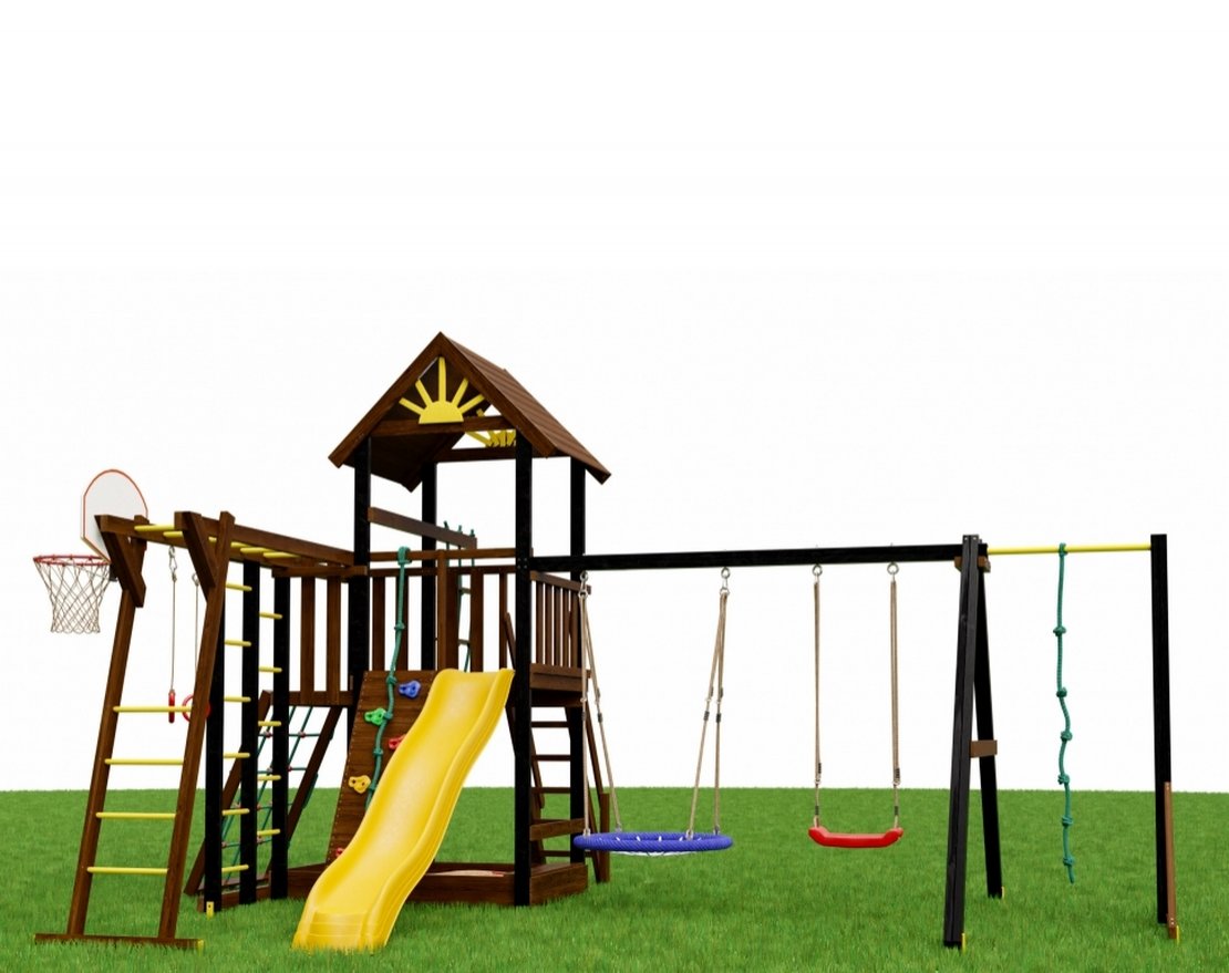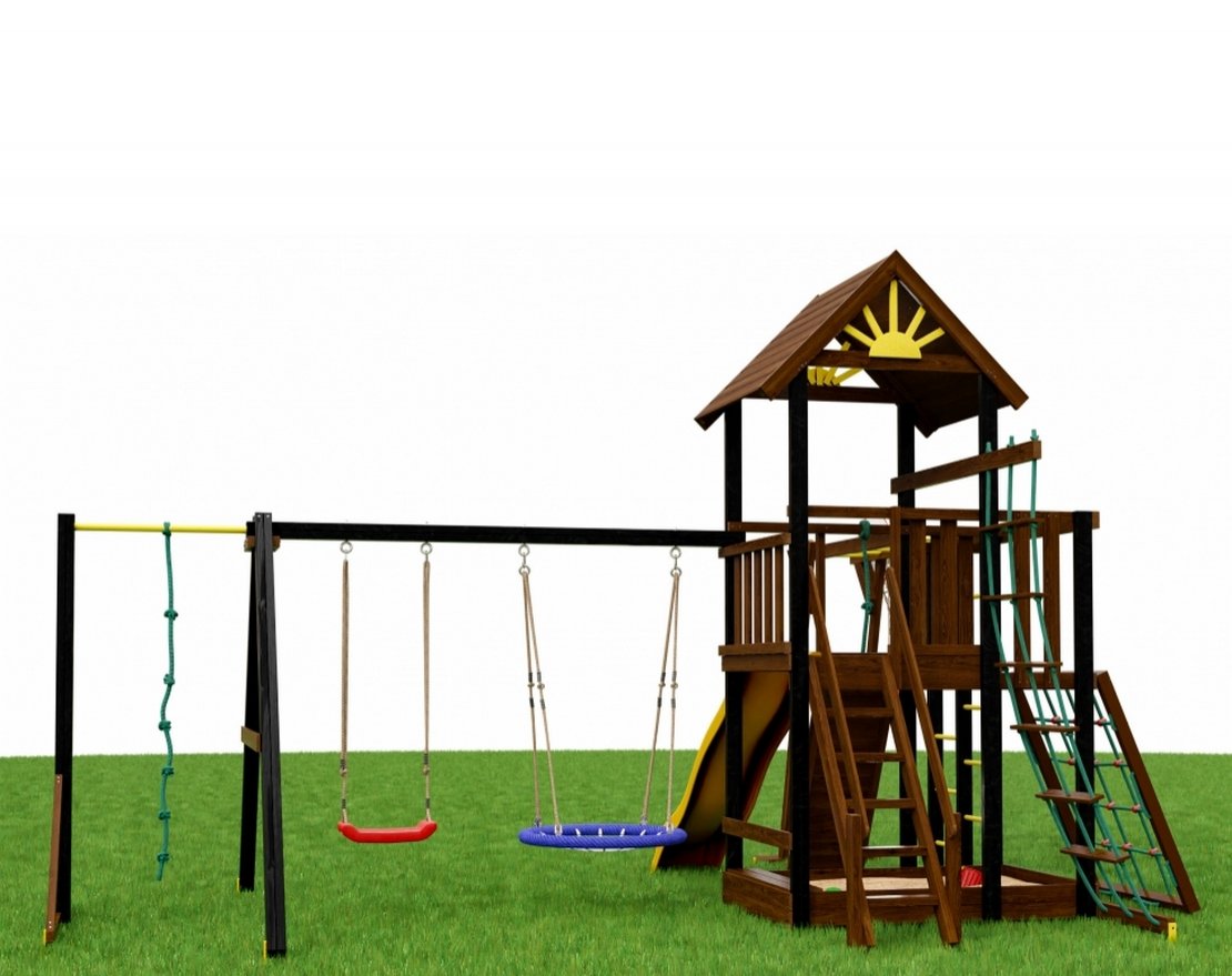 Игровая площадка Флорида 4 с расширенной комплектацией поможет сделать детей активнее, сильнее и здоровее. В ней сохранены все традиционные спортивные модули: качели, лестница, горная стенка, горка, кольцо, рукоход, но есть дополнения в виде турника с канатом и сетки для лазания.