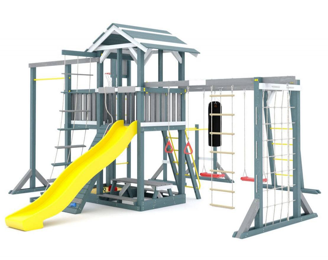 - Комплекс состоит из отдельных блоков, соединённых с башней, находящейся в центре. Вскарабкавшись на неё по скалодрому или лестнице, ребёнок может съехать вниз с горки. Там для малыша мы подготовили уютную песочницу, а также детский игровой столик. Качели типа "лодочка", расположенные рядом, выдержат ребят разного возраста и массы.