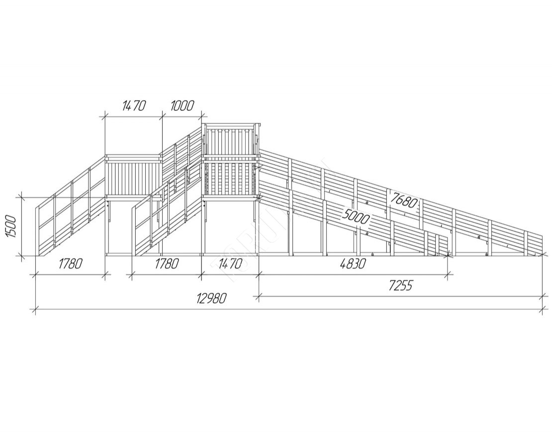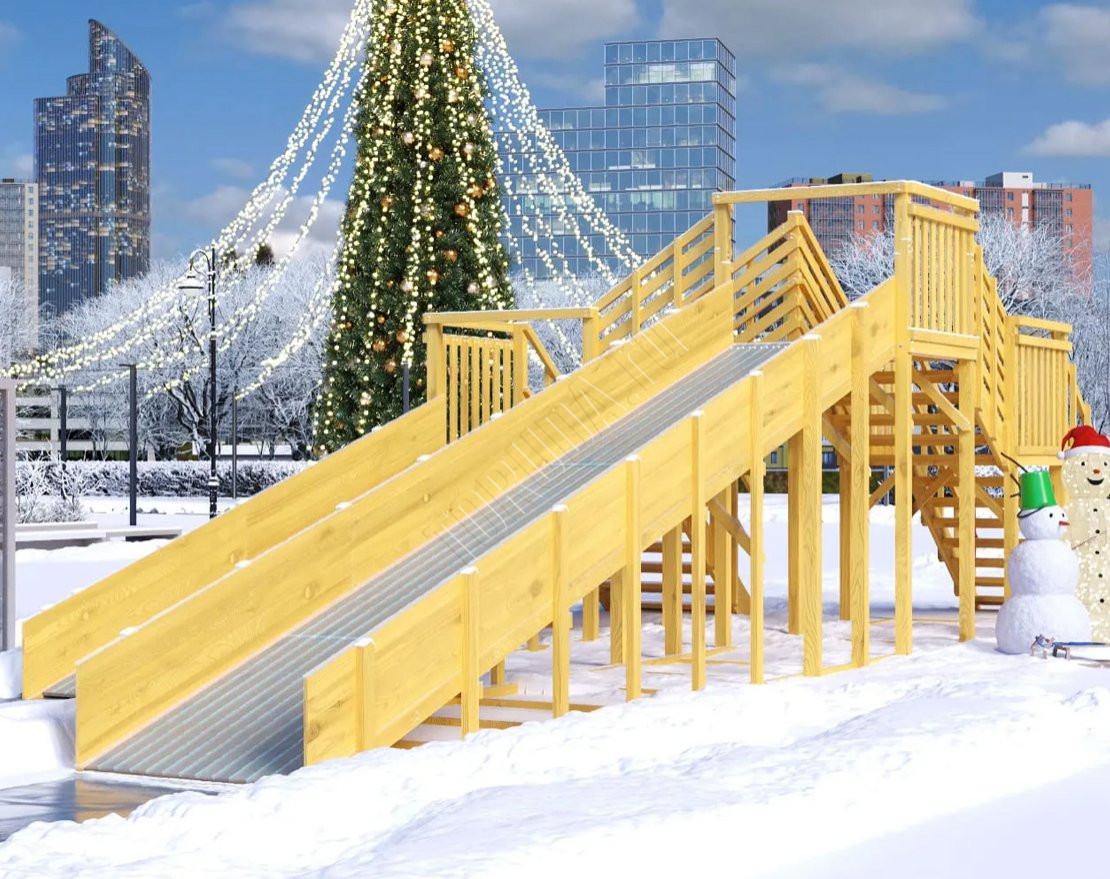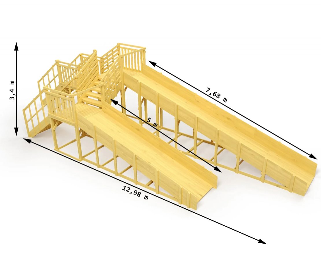 Многоуровневая конструкция с двумя длинными скатами (5 и 7,68 м). Прочный клееный брус делает горку надежной и долговечной.