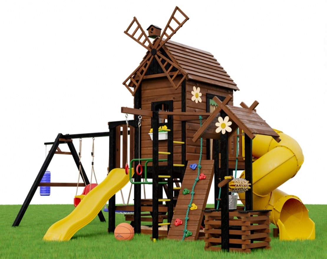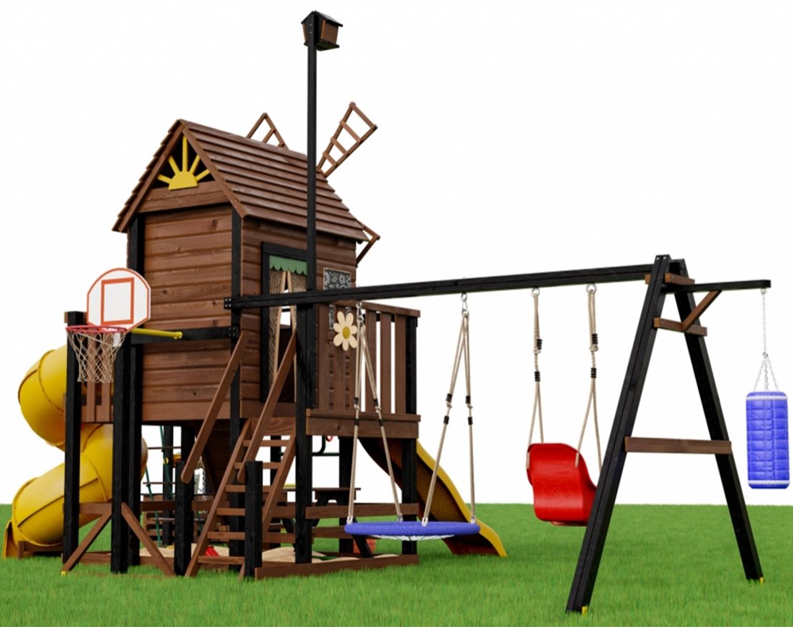 Игровой комплекс Мулен 5 с колодцем — это уютный деревянный домик, наполненный атмосферой приключений. Его узнаваемый силуэт с декоративными лопастями на крыше перенесет детей в мир сказок, где можно представить себя отважным путешественником, хозяином мельницы или капитаном воздушного корабля. Площадка сочетает различные игровые и спортивные элементы, помогая ребенку развивать ловкость, силу и координацию. Лестницы, канаты, качели и горка превращают игру в увлекательное приключение, в котором важно не только фантазировать, но и двигаться. Внутри домика продумано всё до мелочей — каждый уголок наполнен возможностями для игры, творчества и удобства. На втором этаже маленьких художников ждет доска для рисования, где можно воплощать свои фантазии. Два отдельных столика со стульчиками позволяют детям играть, рисовать или устраивать чаепитие, не мешая друг другу. А просторная песочница под домиком станет местом для совместных экспериментов с песочными замками — здесь хватит места всем! Два раздельных входа делают пространство более просторным и удобным, создавая еще больше возможностей для веселой и динамичной игры.
