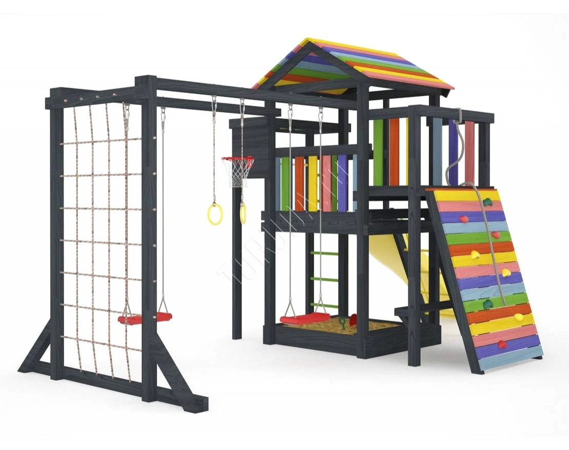 Детская площадка обладает довольно широким функционалом, предназначена для дачи, коттеджа.