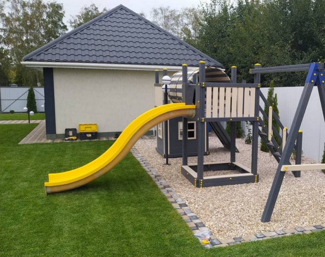 Для максимальной защиты ребёнка от травм, все углы имеют закруглённую форму, крепеж скрыт пластиковыми заглушками. Опоры изготовлены из клеёного бруса толщиной 90*90 мм.