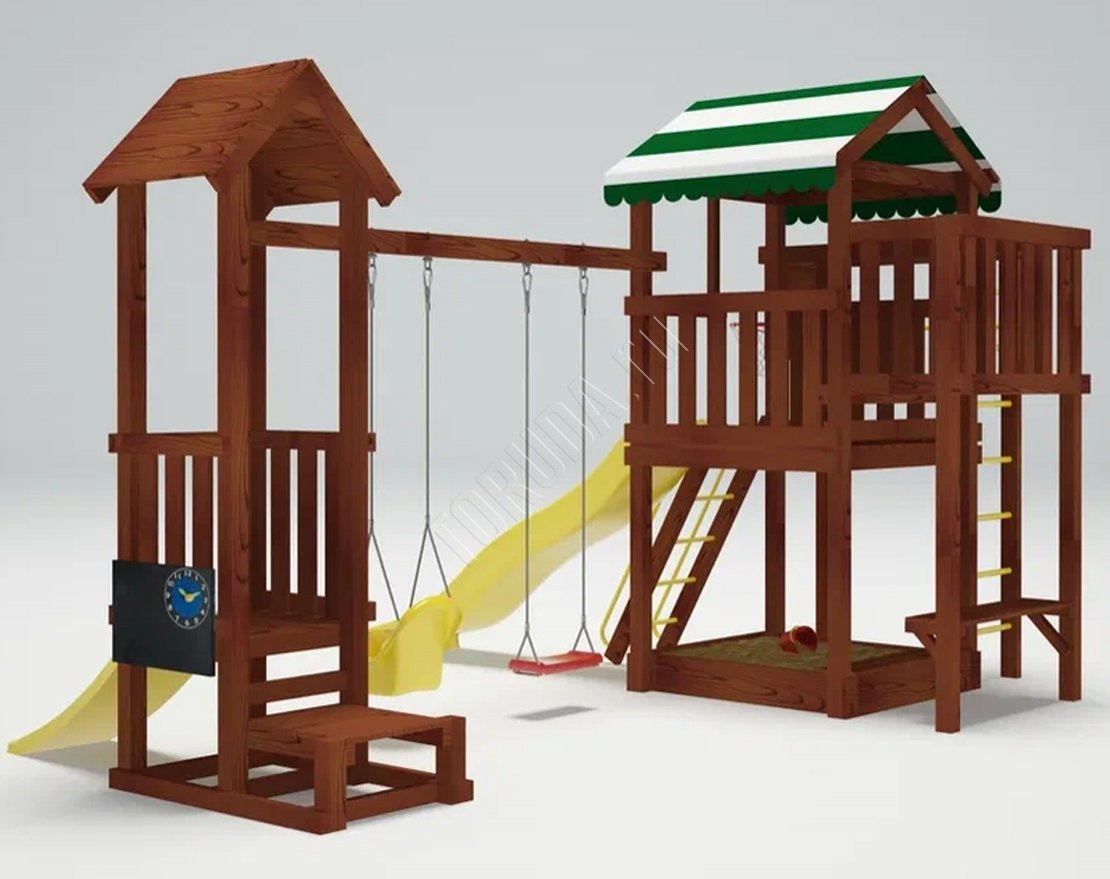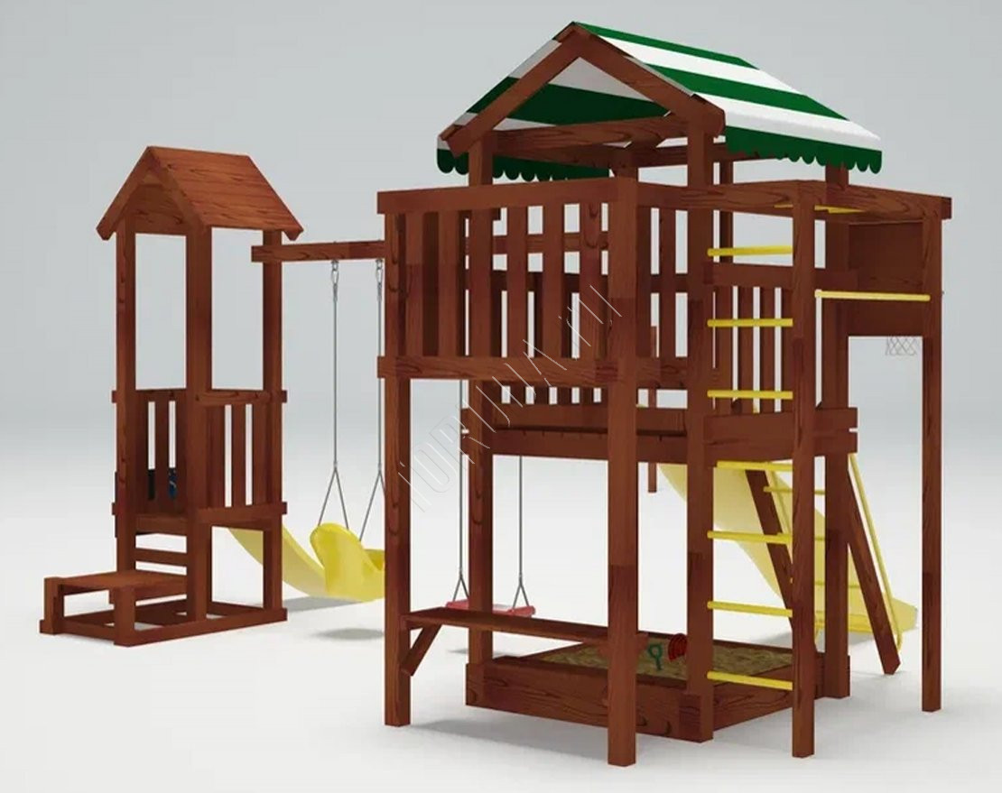 - Устойчивость к погодным условиям: игровые башни с крышей защищают от солнца и осадков, а материалы комплекса рассчитаны на долгий срок службы без сложного ухода.