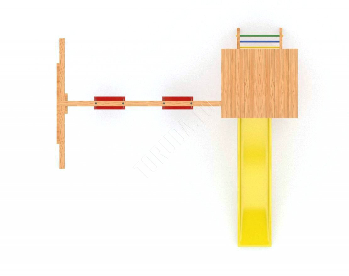 Основной материал натуральный и экологичный – это шлифованный клееный брус, края которого скруглены. Занозы и ссадины исключены. Детская площадка безопасна: конструкция рамы произведена согласно ГОСТ, все крепежи закрыты заглушками, а подвесное снаряжение сертифицировано и создано в Бельгии специально для детей.