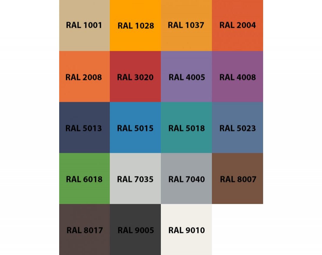 Цвета: RAL 5018 (Бирюзово-синий), RAL 5015 (Небесно-синий), RAL 1019 (Серо-бежевый), RAL 3020 (Транспортный красный), RAL 7035 (Светло-серый), RAL 8017 (Шоколадно-коричневый).