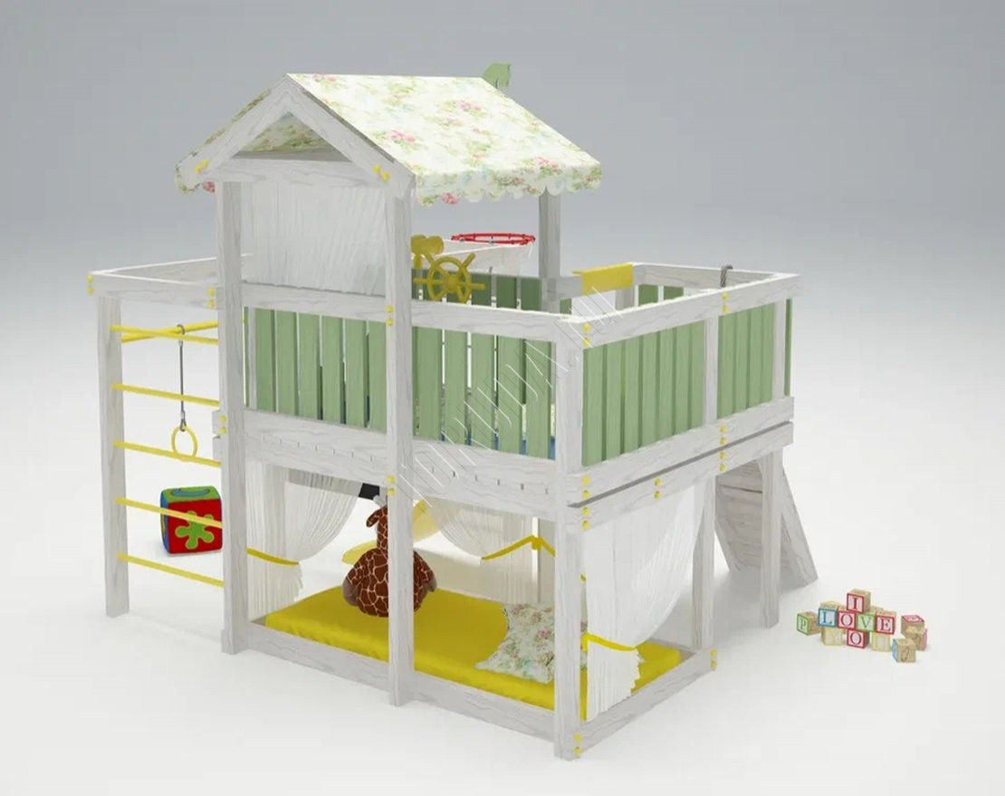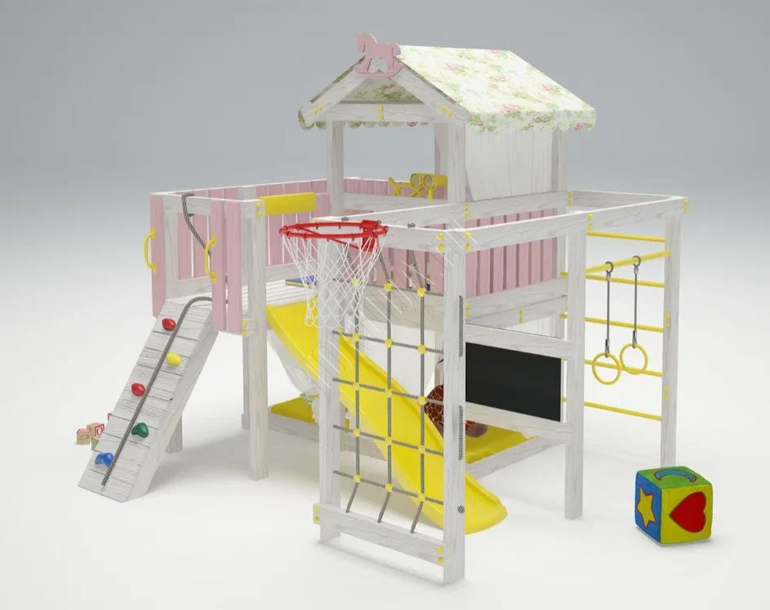 - Основа модульной конструкции – домик. Высота от поверхности пола до платформы составляет 90 см. Взобраться туда непросто. Сделать это можно только по мини-скалодрому. Для облегчения задачи добавили удобный канат. Подъём станет хорошей тренировкой для мышц мальчиков и девочек. Слезать со второго этажа легче. Ребёнок может скатиться по горке. Её длина 175 см.